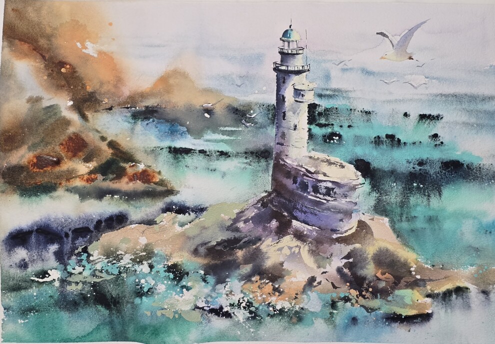Акварель «по сырому» идеально подходит для этой темы: она позволяет краскам течь, как волны, и сливаться, как море с небом во время шторма. Не бойтесь смелых решений — именно они помогут передать мощь и красоту этого места.
